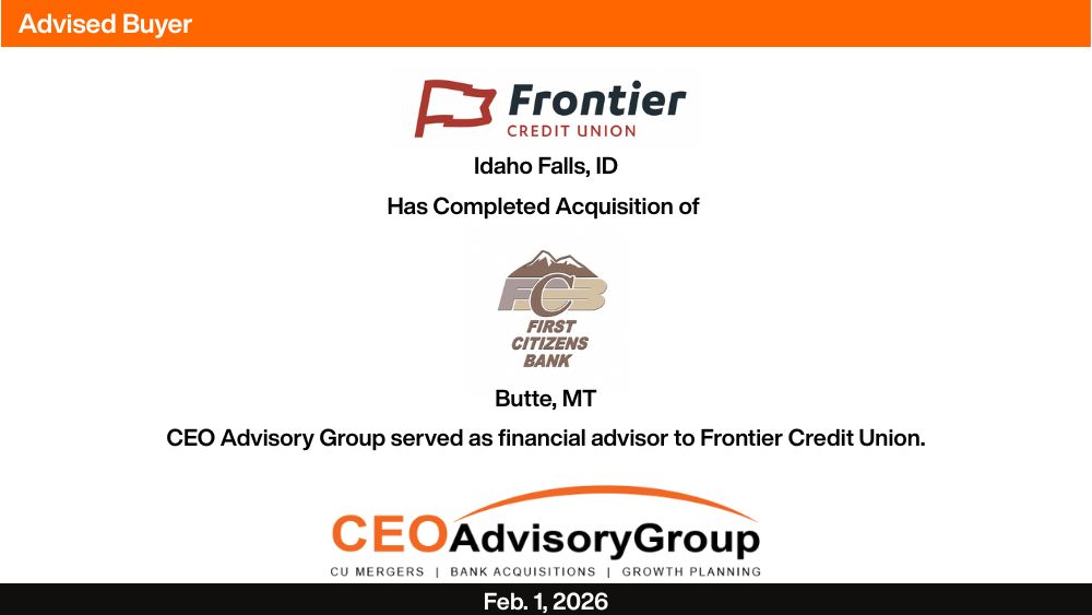 Frontier Credit Union has completed its historic acquisition of First Citizens Bank of Butte, marking the first whole‑bank credit union acquisition in Montana. CEO Advisory Group served as Frontier’s financial advisor, guiding the credit union through regulatory approvals and supporting its strategic expansion into Montana. The transaction strengthens Frontier’s market presence, enhances member access across Idaho and Montana, and reflects the growing trend of credit unions leveraging bank acquisitions for accelerated growth and diversification.